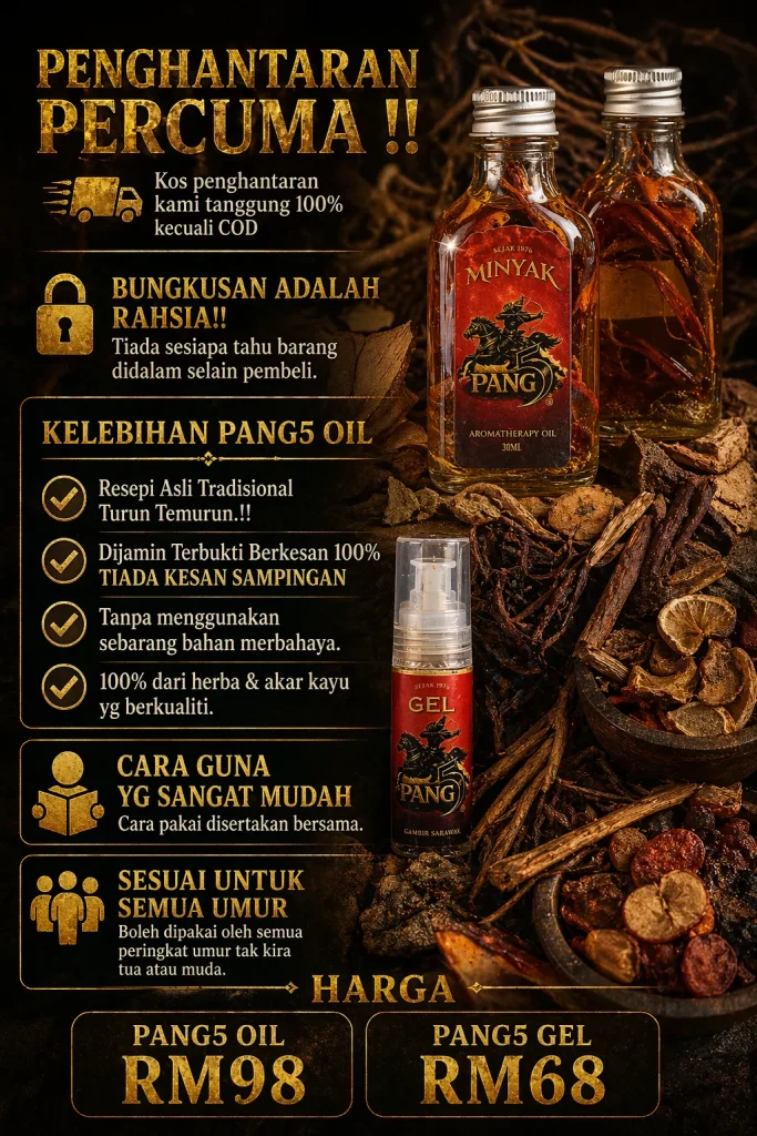 PANG5 Oil merupakan minyak herba tradisional dari bumi Langkawi yang diolah daripada petua lama turun-temurun. Dirumus dengan 48 herba terpilih menjadi minyak urut lelaki berasaskan bahan semula jadi.
